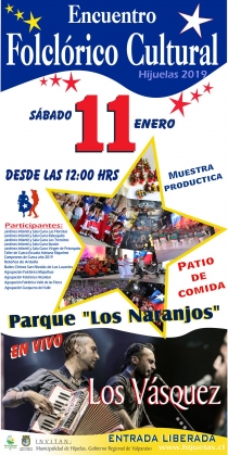 El día sábado 11 de Enero en el Parque Los Naranjos, desde las 12:00 Hrs.se realizará un "Encuentro Folclórico Cultural" Entrada Liberada!Se contará con:-Muestra Productiva (stands con productores de la zona). -Presentaciones Folclóricas de Jardines Infantiles. -Presentaciones de...