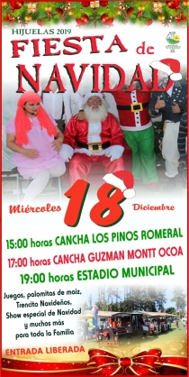 El día miércoles 18 de diciembre, se realizará la Fiesta Navideña en Hijuelas.- 15:00 Horas. Cancha Los Pinos en Romeral- 17:00 Horas Cancha Guzmán Montt en Ocoa- 19:00 Horas Estadio MunicipalJuegos, palomitas de maíz, trencito navideño, Show especial de Navidad y mucho más para toda la familia....