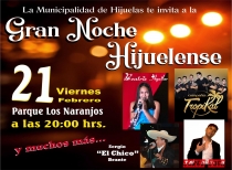 Viernes 21 de Febrero, "Gran Noche Hijuelense 2020". Desde las 20 horas, en el Parque Los Naranjos. - Todo el ritmo de Compañía Tropikal. - La Música Ranchera de Sergio "Chico" Brante. - Las Baladas románticas de Jared Jueh. - La nueva voz y promesa del canto de Hijuelas, Beatriz Aguilar.BUSES...