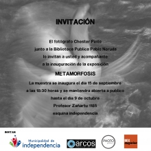 Junto con saludarlos, quisiéramos hacerles extensible la invitación a la inauguración de la exposición "METAMORFOSIS" del fotógrafo Chester Pinto. Esta muestra se inaugura el 15 de Septiembre a las 18:30 horas y se mantendrá abierta a todo público hasta el día 9 de Octubre.