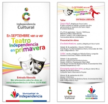 En el marco de Teatro en Primavera, la Corporación de Cultura y Patrimonio de Independencia, invita a todos los vecinos y amigos de la comuna de Independencia a disfrutar y participar de las Obras de Teatro que les ofrecemos en el mes de Septiembre.