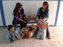 La Directora de la Biblioteca, Alonso de Ercilla y Zúñiga, entrega una caja viajera con 30 libros a la profesora jefe del 1er. año B. Sra Carmen Alvarez, quien cordialmente agradeció el apoyo entregado por la Biblioteca. En la fotografía se muestra a la profesora ayudante y algunos niños del curso revisando el material entregado.