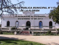 En el marco de los Programas Fomento Lector y Extensión Cultural de la Biblioteca Pública N°115, se efectuó la Clausura de Actividades 2013 el día 19 de diciembre, la certificación fue dirigida por Don Patricio Reyes Gonzalez, asesor de la Biblioteca destacándose la premiación del 1° Lugar en el...