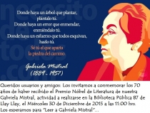 El 30 de Diciembre a las 11:00 hrs., la Biblioteca Pública 87 de Llay Llay rinde un homenaje a los 70 años de haber recibido el Premio Nobel de Literatura de nuestra Gabriela Mistral, un día 10 de Diciembre de 1945. Es un homenaje a la poetisa, a la maestra, a la mujer diplomática. Su...