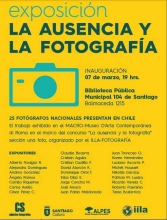 Invitamos a la comunidad a visitar la Exposición Fotográfica la "Ausencia y la Fotografía", que será inaugurada el 7 de marzo del presente año a las 19:00 hrs. en las dependencias de la Biblioteca Pública Municipal N° 104 de Santiago, ubicada en Avenida Presidente Balmaceda #1215 a un costado de la Corporación Cultural Estación Mapocho.