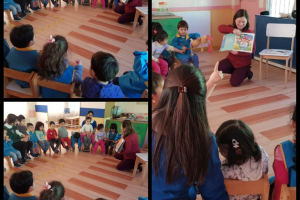 Seguimos conociendo nuestros derechos y deberes. Tías y párvulo del nivel medio menor del jardín Piolín disfrutando del cuento "SE BUSCA!! Lily la Liebre, Ladrona de Libros"