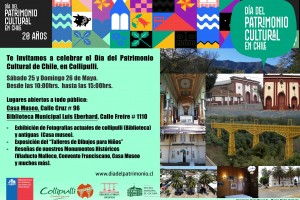 La Municipalidad de Collipulli, a través de su Biblioteca Municipal y la Oficina de Cultura.Te Invitan a conocer Nuestro Patrimonio Cultural, este Sábado 25 y Domingo 26 de Mayo, desde las 10:00 hrs. Hasta las 15:00hrs.Estarán Abiertas las puertas de:Casa Museo, Ubicada en Calle Cruz #96...