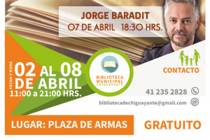 Tercera Versión de la Feria del Libro de Chiguayante. En esta oportunidad contaremos con la visita del célebre escritor chileno Jorge Baradit (7 de abril a las 18.30), conocido por sus populares obras de ficción y ucronías como SYNCO e Historia Secreta de Chile Volúmenes I y II.Cronograma...