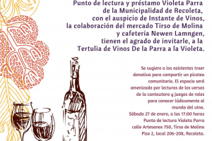 22 enero 2018. Tertulia de vinos "DE LA PARRA A LA VIOLETA". Interesante actividad creada y organizada desde el punto de lectura y préstamos Violeta Parra, del Sistema de Bibliotecas Públicas de la Municipalidad de Recoleta, que enlaza la cultura del vino con la obra de Violeta Parra.