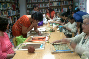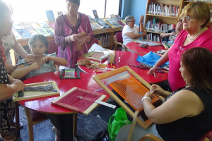 Taller de Lanaterapia . Actividad realizada por la monitora Claudia Castora Cuentacuentos.Las participante elaboran objetos e implementos usando la lana y además como terapia.