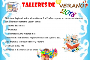La Biblioteca Regional invita a todos los niños a participar de los Talleres de Verano (Enero y Febrero), de 15:00 a 17:30Hrs, de Martes a Viernes.¡LOS ESPEREAMOS A PASAR UNA VERANO ENTRETENIDO EN LA BIBLIOTECA!