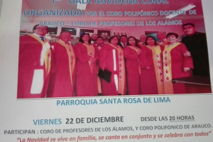 PRIMERA GALA NAVIDEÑA CORAL"LA NAVIDAD SE VIVE EN FAMILIA, SE CANTA EN CONJUNTO Y SE CELEBRA CON TODOS"ORGANIZADA POR EL CORO POLIFÓNICO DOCENTE DE ARAUCO Y EL CORO DE PROFESORES DE LOS ALAMOS.LUGAR: PARROQUIA SANTA ROSA DE LIMA, LEBUDÍA : VIERNES 22 DE DICIEMBREDESDE LAS 20...