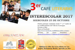 El Taller Literario Lunasol de la Biblioteca CRA, enseñanza media; Departamento de Lenguaje del Liceo Mixto de Los Andes y la Biblioteca Pública Hermano Emeterio José de Los Andes, convoca al Primer Concurso de Poesía Interescolar a estudiantes de 7° a 4° medio de todos los establecimientos...