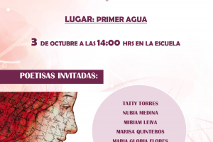 El próximo martes 3 de octubre realizaremos la primera lectura poética femenina en el sector rural de Primer agua.Entre nuetras invitadas estarán connotadas poetisas locales y regionales como TatyTorres, Maria Gloria Flores, Maria Lorena Poblete, Marisa Quinteros , Nubia Medina ,Minerva Mecina y...