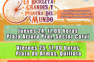 “La bicicleta más grande y más pequeña del mundo” se presentará JUEVES 24 de agosto 17:00 hrs., Plaza Arturo Prat sector corviVIERNES 25 de agosto 17:0 hrs., Plaza de Armas QuillotaSÁBADO 26 de agosto 17:00 hrs., Avenida Dueñas, San Pedro disfruta de este show a nivel internacional y ganador del...