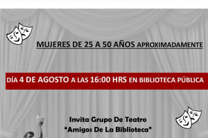 CASTING PARA MUJERES DE 25 AÑOS EN ADELANTE, EN BIBLIOTECA MUNICIPAL.El viernes 4 de agosto a las 16:00 hrs. realizaremos el primer casting teatral en vuestra Biblioteca, con el objetivo de conformar el grupo de teatro " Amigos de la Biblioteca ".Están todas invitadas a esta nueva apuesta artística...