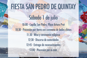 Toda la comunidad de casablanca esta invtada a Quintay este sábado a celebrar con la ya tradicional procesión de San Pedro, con toda la mística que la caleta representa en esta tradicional actividad costera. debido al mal tiempo se debió aplazar y así como este fin de semana la...