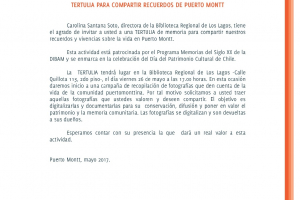 Estimados y estimadas : Tengo el agrado de invitar a Ud. a una TERTULIA PARA COMPARTIR RECUERDOS DE PUERTO MONTT, a realizarse en la Biblioteca Regional de Los Lagos, el viernes 26 de mayo a las 17.00 hrs. Esta actividad está patrocinda por el Programa Memorias del Siglo...