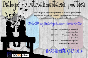 DIÁLOGOS DE RETROALIMENTACIÓN POÉTICA Imparten: Domingo Retamal H. y Nino Morales, poetas pertenecientes al Colectivo Orgasmar.La poesía hoy por hoy carece de un punto de inflexión, vale decir: sigue atada a los mismos mecanismos de producción, a los mismos espacios institucionales, a los...