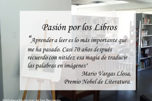 Desde el mes de Enero del 2017, nuestra Biblioteca Municipal cuenta con la sección "Pasión por los Libros", con el fin de informar a través de nuestra cuenta Facebook Biblioteca de San Bernardo, sobre tip's, comentarios, investigaciones, etc. sobre como ha influído la lectura, las bibliotecas, y en...