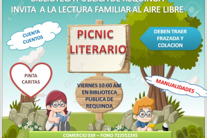 La Biblioteca Pública de Requínoa realizará un Picnic Literario al aire libre en el jardín del establecimiento, para fomentar la lectura, para esta actividad contaremos con una cuenta cuentos, se realizarán manualidades y pintacaritas.Se dará inicio a las 10:00 AM hasta las 12:00 PM.Esperamos a...