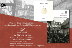 Comparto con ustedes esta invitación al lanzamiento de la re-edición del libro "LP Codex Final" del escritor, académico y también editor, Marcelo Novoa, acompañado del editor Máximo González.