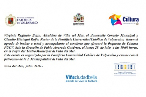 Comparto con ustedes invitación para asistir al concierto organizado por la Pontifica Universidad Católica de Valparaíso, el día jueves 28 de julio, a las 19:00 horas, en el Foyer del Teatro Municipal de Viña del Mar, con la presentación de la Orquesta de Cámara PUCV...