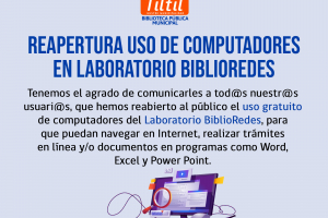 Les informamos que después de un largo tiempo el Laboratorio BiblioRedes (computación) vuelve con el servicio de uso de computadores de forma gratuita para que puedas navegar en Internet, realizar trámites en línea o documentación en programas como Word, Excel y Power Point.¡L@s esperamos!