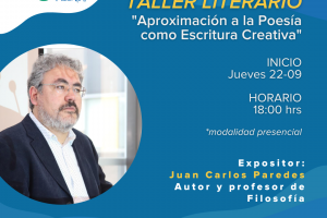 Este jueves 22 se inicia el Taller Literario: "Aproximaciones a la Poesía como Escritura Creativa" de nuestro amigo colaborador, el autor y profesor de filosofía don Juan Carlos Paredes. Se estarán realizando cada jueves hasta fin de año en nuestra Biblioteca #34 ubicada en Av...