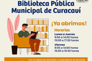 La Biblioteca Municipal de Curacaví se encuentra atendiendo al público a un costado de la Municipalidad de Curacaví. Para inscripciones llevar tu cédula de identidad y comprobante de domicilio.UbicaciónAv. Ambrosio O’Higgins 1253Fono: 222992171biblioteca@municipalidadcuracavi.clHorario de...
