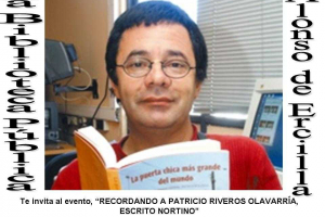La Biblioteca Pública Municipal N°182, te invita al evento, Recordando a Patricio Riveros Olavarría, Escrito Nortino, a efectuarse en esta Biblioteca (Gorostiaga #202), el Martes 31 del presente a las 19:30 hrs.
