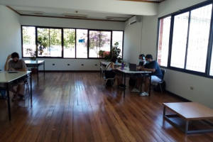 Jóvenes de la comunidad hacen uso de la sala de estudio de la Biblioteca para estudiar o trabajar, ya que la consideran un espacio tranquilo para su concentración. Te invitamos a venir a nuestra Biblioteca.