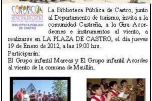 La Biblioteca Pública de Castro, junto al Departamento de Turismo, invita a la comunidad Castreña, a la Gira Acordeones e instrumentos al viento, a realizarse en LA PLAZA DE CASTRO, el día jueves 19 de Enero de 2012, a las 19:00 hrs.