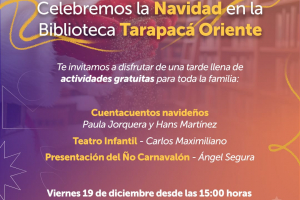 La Biblioteca Municipal Tarapacá Oriente invita cordialmente a la comunidad a participar de una Actividad Navideña Familiar, este viernes 15 de diciembre, a partir de las 15:00 horas. te esperamos . cual duda llamar al fono 432380362