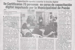 El sábado 30 de julio del presente, se publico en el diario local, la noticia de la certificación de los cursos impartidos por la Biblioteca Mariano Latorre de Pucón. En este artículo se resumió la iniciativa del programa Biblioredes y del apoyo fundamental de las autoridades locales a la...