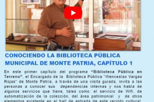 En este primer capítulo del programa “Biblioteca Pública en Terreno”, el Encargado de la Biblioteca Pública “Wenceslao Vargas Rojas” de Monte Patria, a través de una visita guiada, invita a las personas a conocer sus dependencias internas y nos habla de algunos servicios que tiene...