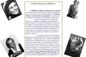 Gabriela Mistral en la Biblioteca            La Biblioteca Pública Municipal de La Florida, en el marco de sus actividades de extensión, durante tiene al servicio de la comunidad la exposición “Gabriela Mistral: a cien años de su nacimiento”,...