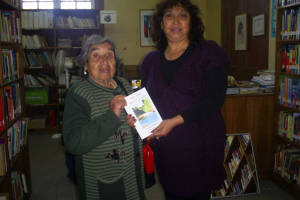 La escritora de la Provincia del Huasco hace entrega de su libro titulado "Aguas Multicolor" Poemas Populares Vallenar, a la funcionaria Patricia De la Vega Tapia, para que forme parte de la colección bibliográfica del Rincón del los Escritores de la Región de Atacama.