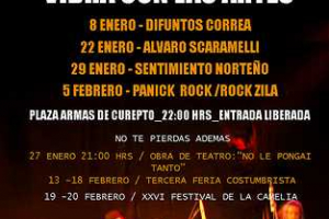 Presentación de Grupos Artistas y Grupos Musicales en LA PLAZA DE ARMAS DE CUREPTO, ENTRADA LIBERADA, día Viernes a las 22: hras.