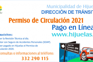 Ya se encuentra activado en el sitio web www.hijuelas.cl de la Municipalidad de Hijuelas, el pago en línea del Permiso de Circulación 2021. Evita aglomeraciones y ahorra tiempo. Requisitos: - Tener la Revisión Técnica al día. - Contar con Seguro de Accidentes Personales (SOAP). -...
