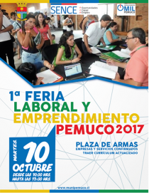 El Alcalde de Pemuco Johnnson Guíñez Núñez y el Director Regional del SENCE, Daniel Jana Torres, Invitan a la comunidad de pemuco a participar de la "Primera Feria Laboral y Emprendimiento Pemuco 2017". Plaza de Armas desde las 10:00hrs. el 10 de octubre. Empresas Confirmadas: Curimapu,...