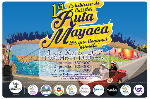 Se invita cordialmente a toda la comunidad de Quillota a participar de la "1era Exhibición  de Carritos Ruta Mayaca, los que llegamos primero", actividad organizada por Población El Mirador de Cerro Mayaca con la colaboración de la Municipalidad de Quillota y diversas organizaciones de la ciudad.