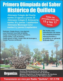 Actividad Tricentenario "Primera Olimpíada del Saber Histórico de Quillota"Organiza la Municipalidad de Quillota, Comisión Tricentenario, Museo Histórico Arqueológico y Empresa Periodística El Observador.Participan los colegios de la ciudad. Entrada Libre.