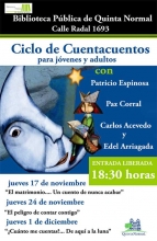 La Biblioteca Pública de Quinta Normal presentará durante noviembre y diciembre un Ciclo de Cuentacuentos gratuito para jóvenes y adultos, el cual inicia este jueves 17 de noviembre, a las 18:30 horas, con la presentación del cuentacuentos Patricio Espinosa con el espectáculo El matrimonio Un cuento de nunca acabar. Actividad que se realizará en el auditorio de la Biblioteca, ubicada en calle Radal 1693, comuna de Quinta Normal.