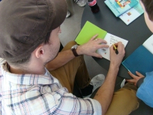 Tal como estaba planificado, el encuentro comenzó con la exhibición del cortometraje animado "Perdido y Encotrado", el cual es una adaptación del cuento del mismo nombre. Un grupo de casi 50 niñas y niños acompañados por sus mamás, papás y apoderados disfrutaron de la pelicula, para luego escuchar un cuento narrado por Patricio Espinosa, que al mismo tiempo fue ilustrado por Oliver Jeffers. Para finalizar, el joven ilustrador compartió con los asistentes en un taller de aviones de papel, los cuales fueron probados en los jardines del interior de la biblioteca y la casona Dubois.