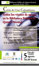 La Biblioteca Pública de Quinta Normal y la embajada de Colombia tienen el agrado de invitarlos a participar del primer Ciclo de Cine Colombiano gratuito que se realizará todos los viernes de agosto, a las 18:30 horas, en el Auditorio Central de la Biblioteca Pública ubicada en Calle Radal 1693, comuna de Quinta Normal.