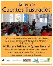 El miércoles 10 de abril de 2013 a las 17:00 hrs. realizaremos en Sala Juvenil de Biblioteca Pública de Quinta Normal un Taller de Cuentos Ilustrados, se trata de una actividad creativa orientada a jóvenes de 10 a 18 años que es parte de nuestra celebración del "Mes del Libro y la Lectura". Inscripciones gratuitas al fono 2 892 87 83 o en nuestro mesón de préstamos.