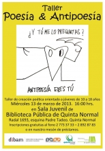El miércoles 13 de marzo a las 16:00 hrs. realizaremos en Sala Juvenil de Biblioteca Pública de Quinta Normal un entretenido taller titulado Poesía & Antipoesía, se trata de una actividad de creación poética orientada a jóvenes de 10 a 18 años. Inscripciones gratuitas al fono 2 773 37 33 - 2 892 87 83 o en nuestro mesón de préstamos. L@s esperamos :)