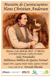 Durante abril tendremos muchísimas actividades especiales en torno a la celebración del Mes del Libro; les invitamos a la Maratón de Cuentacuentos Hans Christian Andersen que realizaremos el martes 2 de abril de 2013 a las 17:00 hrs. en Sala Novedades de Biblioteca Pública de Quinta Normal;...