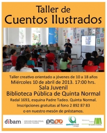 El miércoles 10 de abril de 2013 a las 17:00 hrs. realizaremos en Sala Juvenil de Biblioteca Pública de Quinta Normal un Taller de Cuentos Ilustrados, se trata de una actividad creativa orientada a jóvenes de 10 a 18 años que es parte de nuestra celebración del "Mes del Libro y la Lectura"....